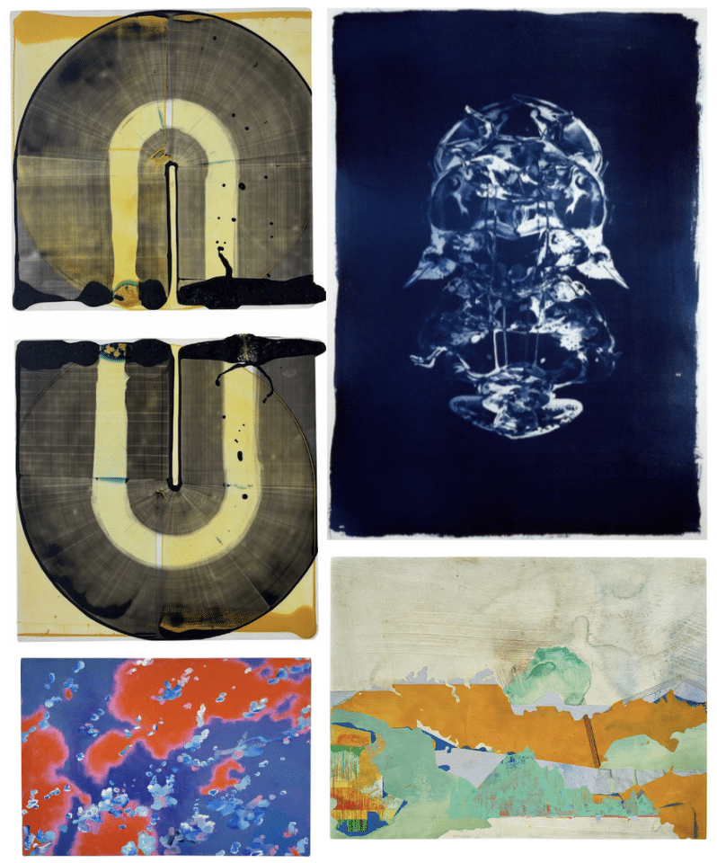Top left: Nellie King Soloman, “U 46 & 47 (Diptych)”, 2023. Top right: Tanja Geis, “See Bird 1”, 2016 cyanotype. Bottom Left: July Guzman, “Expected to Fly” 2023, oil paint. Bottom right: Hughes/Starkweather, “Depleted Aquifer (Pipe Dreams)” 2025 gouache, graphite, ink, salt, and river water on paper and wood panel. Images courtesy of the Bolinas Museum.