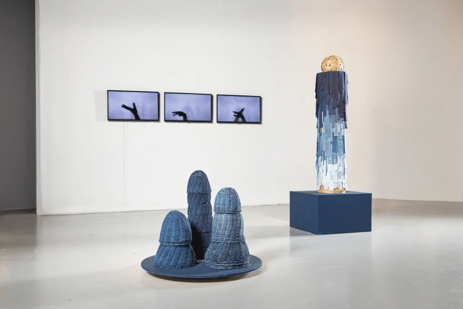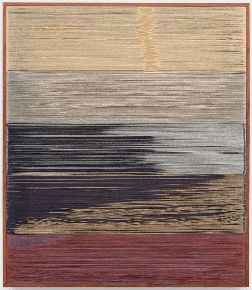 Carolina Jiménez, “After the Rain” 2025, linen, cotton, indigo dye, redwood frame. Image courtesy of Blunk Space.