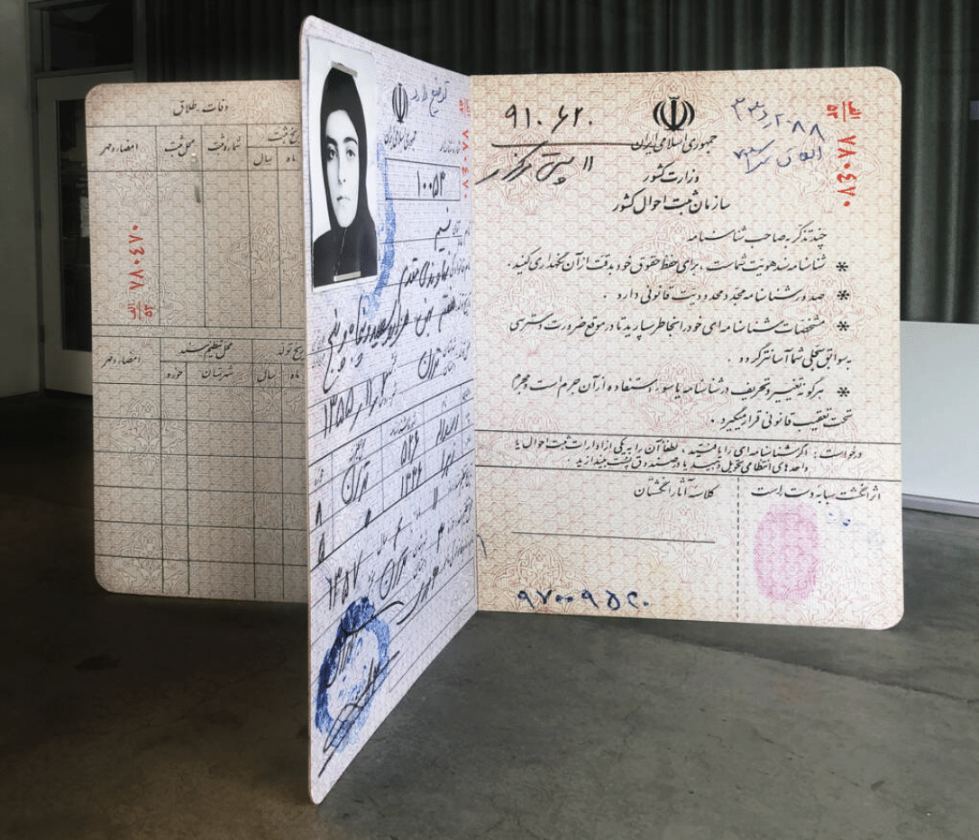 Nasim Moghadam, “Birth Certificate” 2019, archival pigment print, plywood, metal, black fabric. Image courtesy of Kala Gallery.